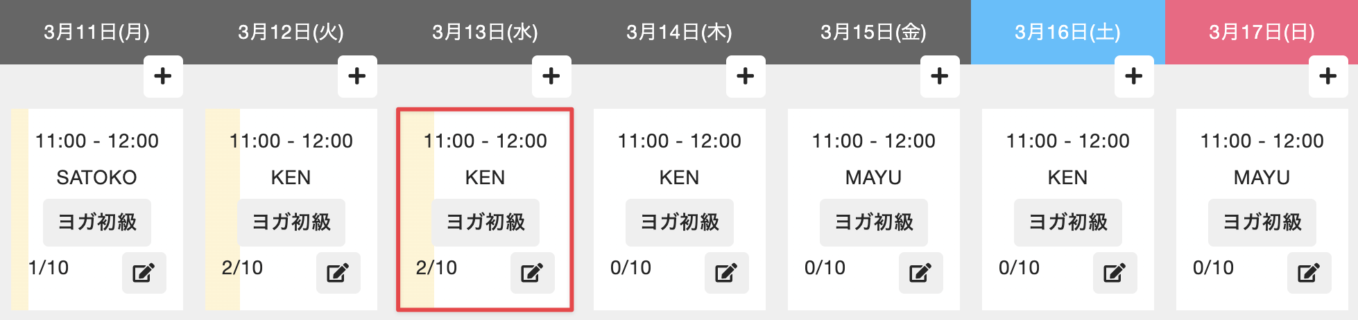 - 管理サイトのサイドバーから[運営]>[予約スケジュール]を選択し、キャンセル対象の店舗、予約カテゴリ、レッスン日の週を選択します。