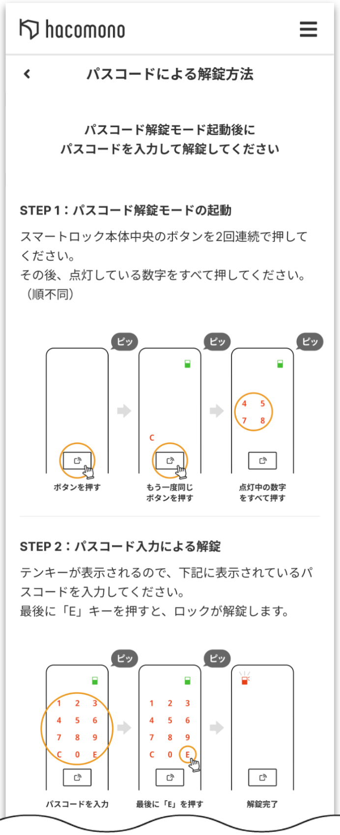 パスコード入力による解錠は、以下の手順で行います。