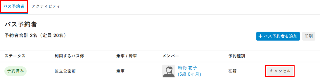 - [バス予約者]タブを選択し、キャンセルするメンバーの[キャンセル]をクリックします。