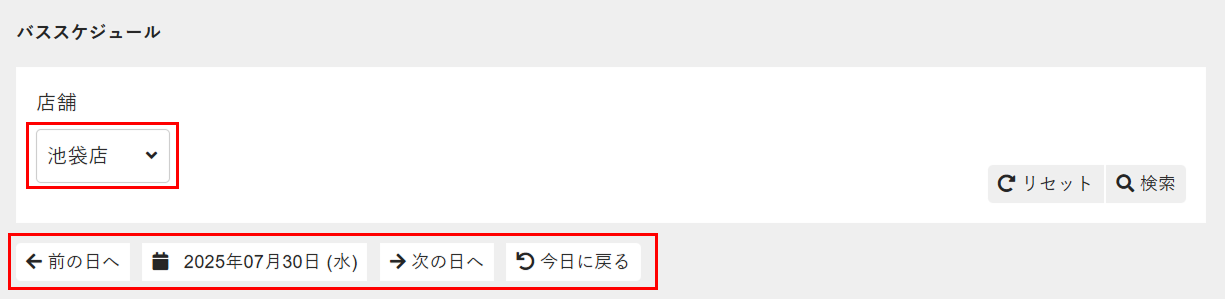 - バススケジュールの一覧画面で、予約者を登録する店舗と日付を選択します。