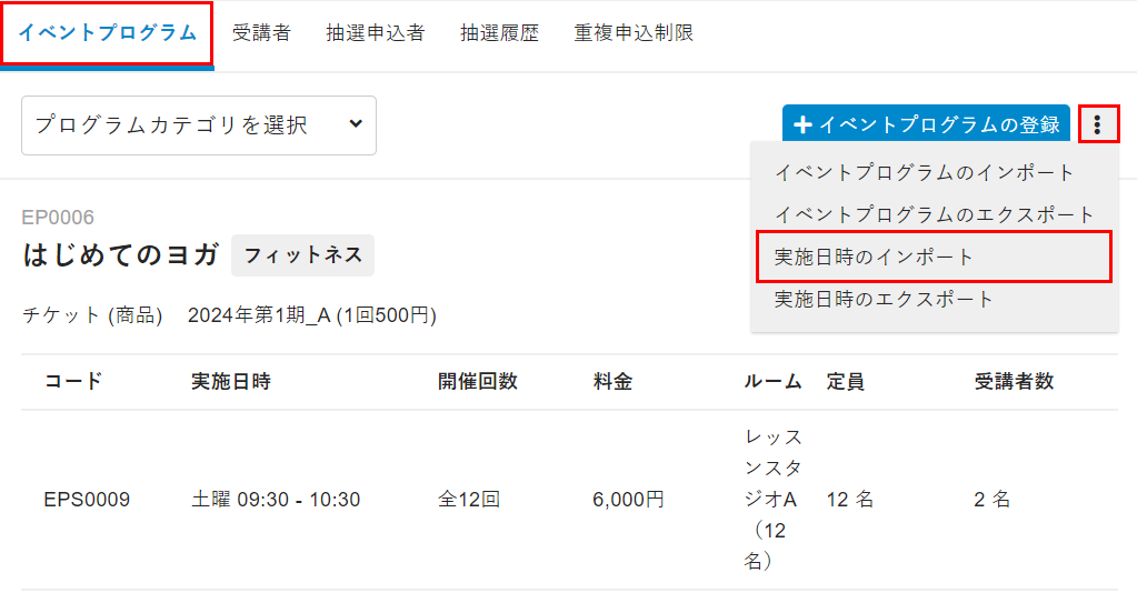 [イベントプログラム]で、[?]をクリックして[実施日時のインポート]を選択します。