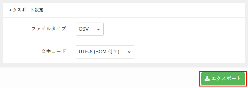 Note:[ファイルタイプ]で[TSV]を選択すると、TSV形式でファイルがエクスポートされます。TSV形式では、各項目がカンマ(,)はなく、タブで区切られます。 - [文字コード]から、[UTF-8(BOM付き)]を選択します。