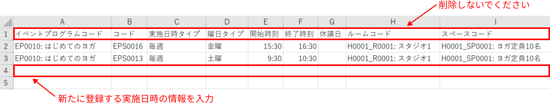 エクスポートしたCSVファイルには、項目名がヘッダー行(1行目)に、登録済みの実施日時のデータがある場合は、2行目以降に入力されています。ヘッダー行は削除しないでください。