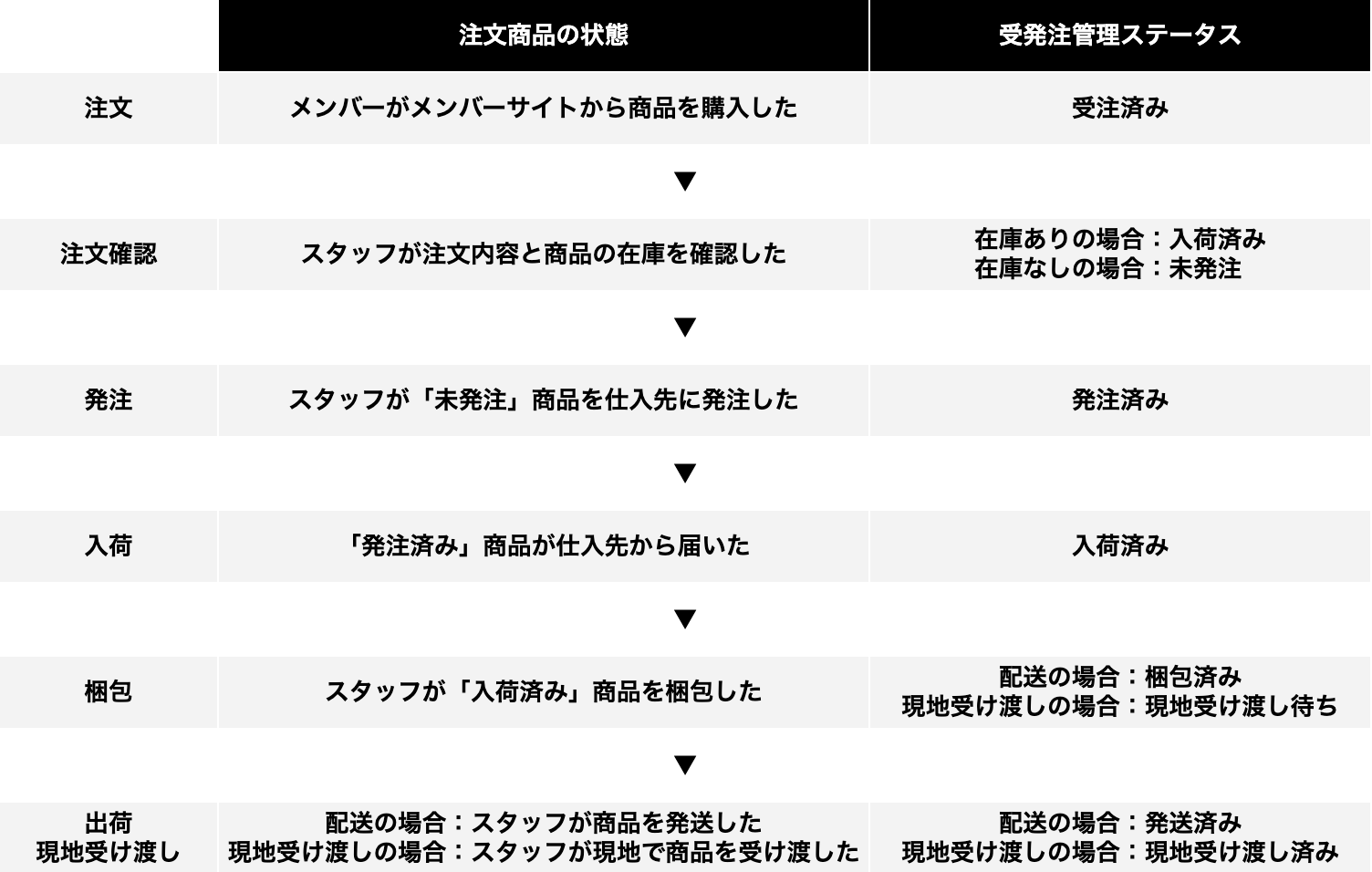 オンライン物販の注文商品ごとの状態は「受発注管理ステータス」で管理します(「オンライン物販の受注商品を管理する」を参照)。受発注管理ステータスは、初期状態では、「受注済み」、「対応中」、「発送済み」、「引き渡し済み」が登録されています。