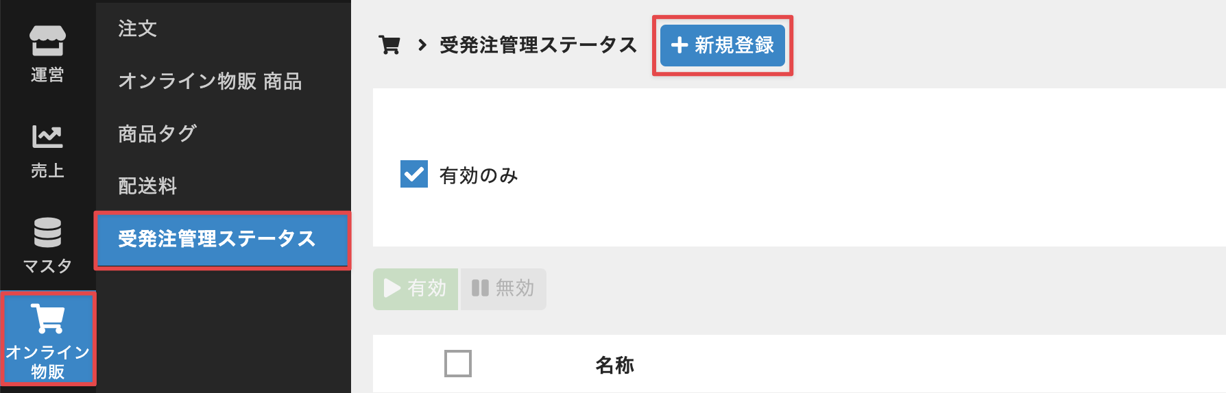- 管理サイトのサイドバーから[オンライン物販]>[受発注管理ステータス]を選択し、受発注管理ステータスの一覧画面で[新規登録]をクリックします。
