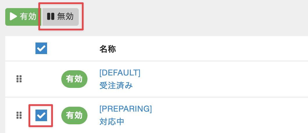 Note:受発注管理ステータスは削除できません。不要になった受発注管理ステータスは、受発注管理ステータスの一覧画面でチェックを入れ、[無効]をクリックして無効にします。無効にしても、既存の注文商品に設定されている受発注管理ステータスには影響しません。