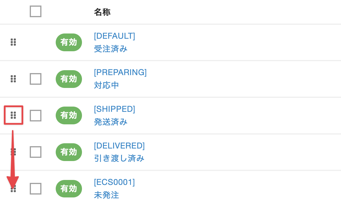 Note:受発注管理ステータスの並び順を変更するには、受発注管理ステータスの一覧画面で移動したい受発注管理ステータスの行の左端のアイコンにマウスポインタを合わせて、移動先の位置にドラッグ&ドロップします。