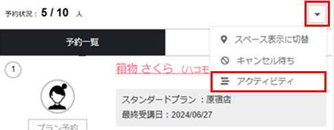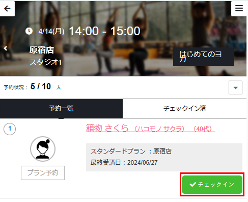Note:予約をキャンセルしたメンバーは表示されません。キャンセルしたメンバーを確認するには、[⌵]をタップし[アクティビティ]を選択します。 - チェックイン手続きが完了します。