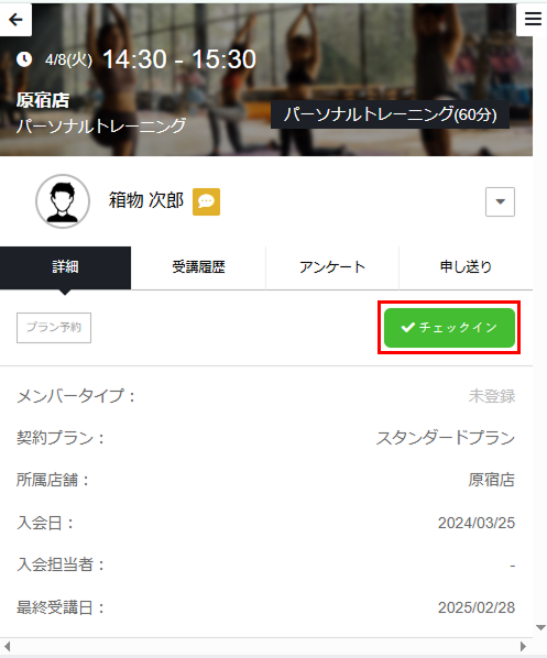 Note:チェックインを取り消す場合は、レッスンの詳細画面の[チェックイン済]タブでメンバーの名前をタップし、[チェックイン取消]をタップします。