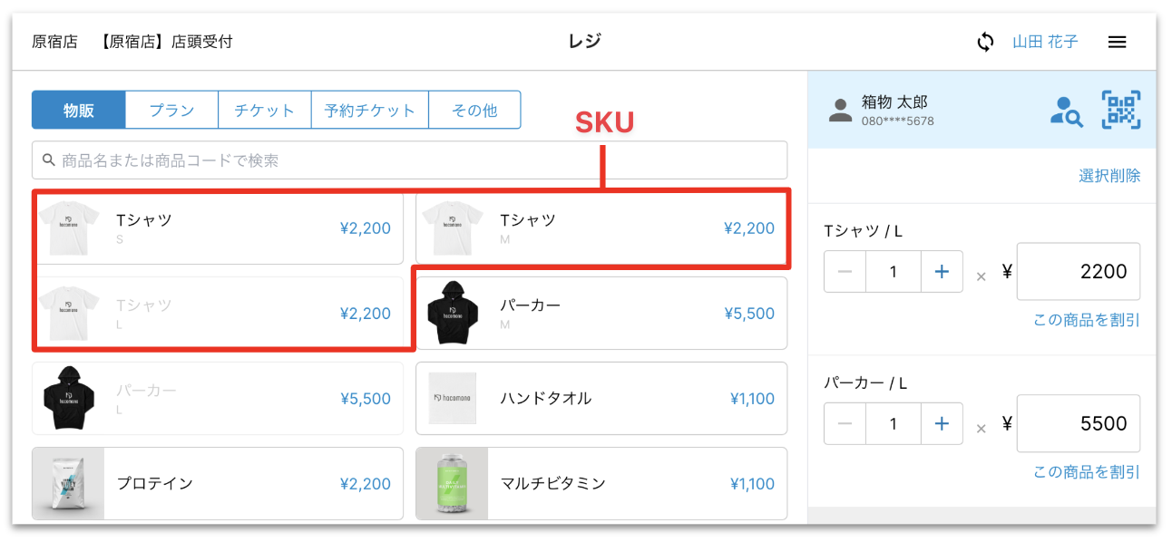 | SKU | この商品のSKU(Stock Keeping Unit)。 SKUごとに、[SKU名]、[原価]、[バーコード]、[サムネイル用写真]を設定します。 在庫管理を行う商品は[SKU]の設定が必須です。 バーコードリーダーを利用する場合、[バーコード]に、バーコードの数字を入力します。バーコードリーダーに接続することで(「バーコードリーダーを設定する」を参照)、商品に印字されているバーコードを読み取り、レジ画面のカートに商品を追加できます。バーコードの種類は、JANとNW-7をサポートしています。 登録したSKUが1つの商品としてレジ画面に表示されます。 [SKU名]と[サムネイル用写真]は、レジ画面に表示されます(下記Noteの�C、�A)。 [SKU]と[基本設定]の両方に[サムネイル用写真]を設定した場合は、[SKU]の設定がレジ画面に表示されます。