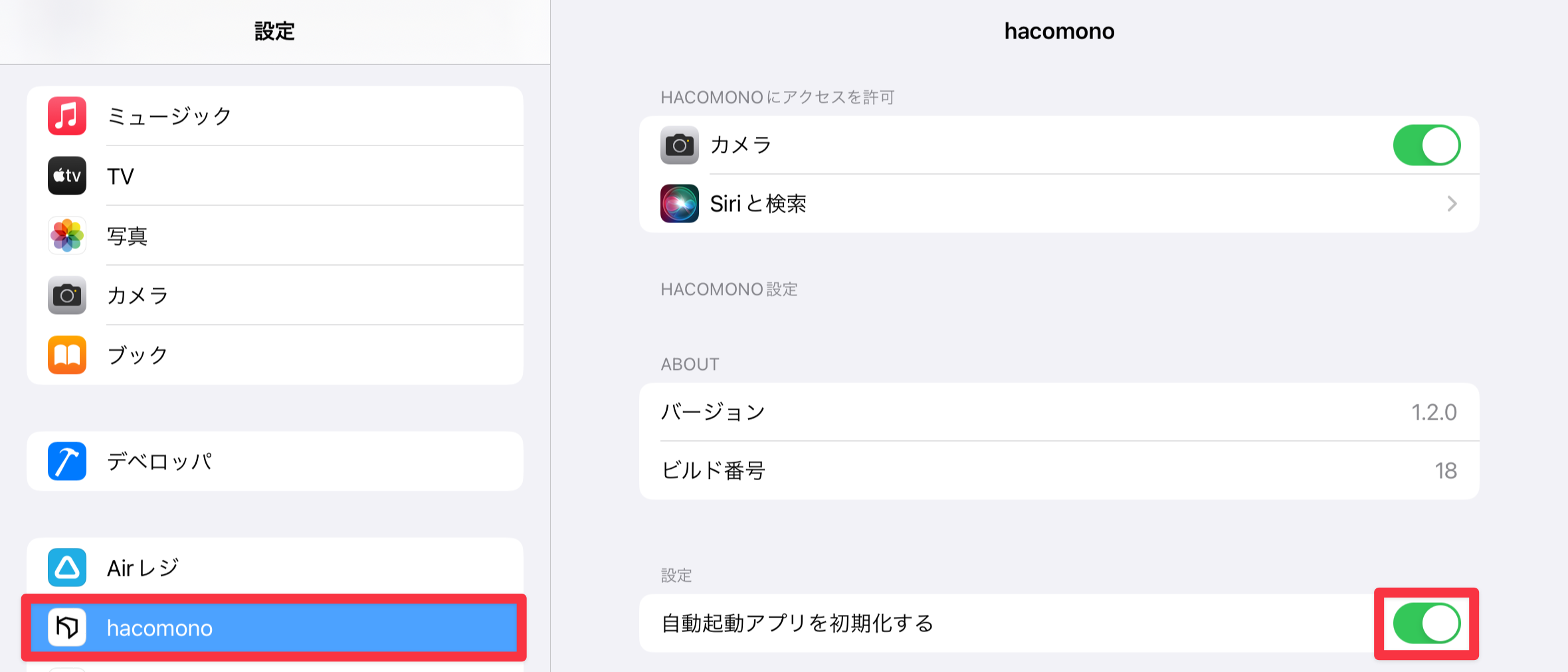- 左のパネルから[hacomono]を選択し、[自動起動アプリを初期化する]をオンにします。