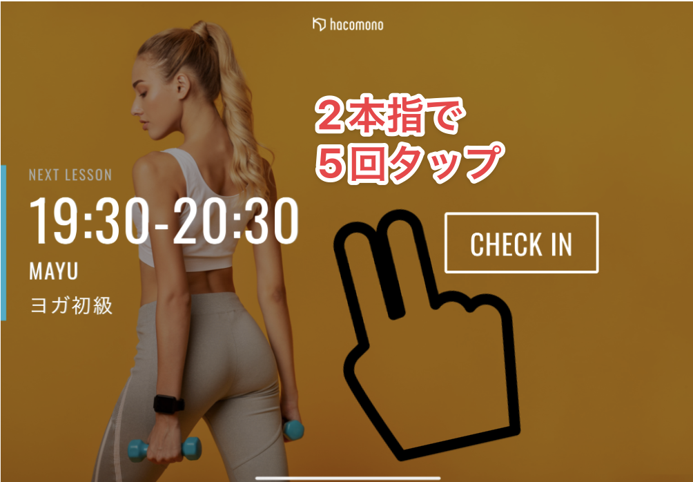 初期設定では、チェックインアプリや物販アプリなどの画面上を2本指で5回連続タップすると、店頭iPadアプリのトップ画面に戻ります。