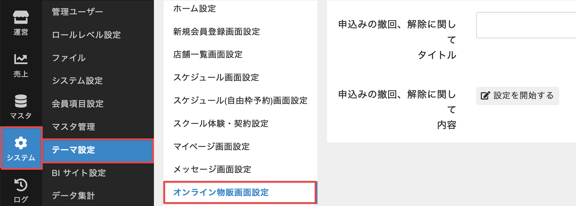 - 管理サイトのサイドバーから[システム]>[テーマ設定]を選択し、テーマ設定画面で[オンライン物販画面設定]を選択します。