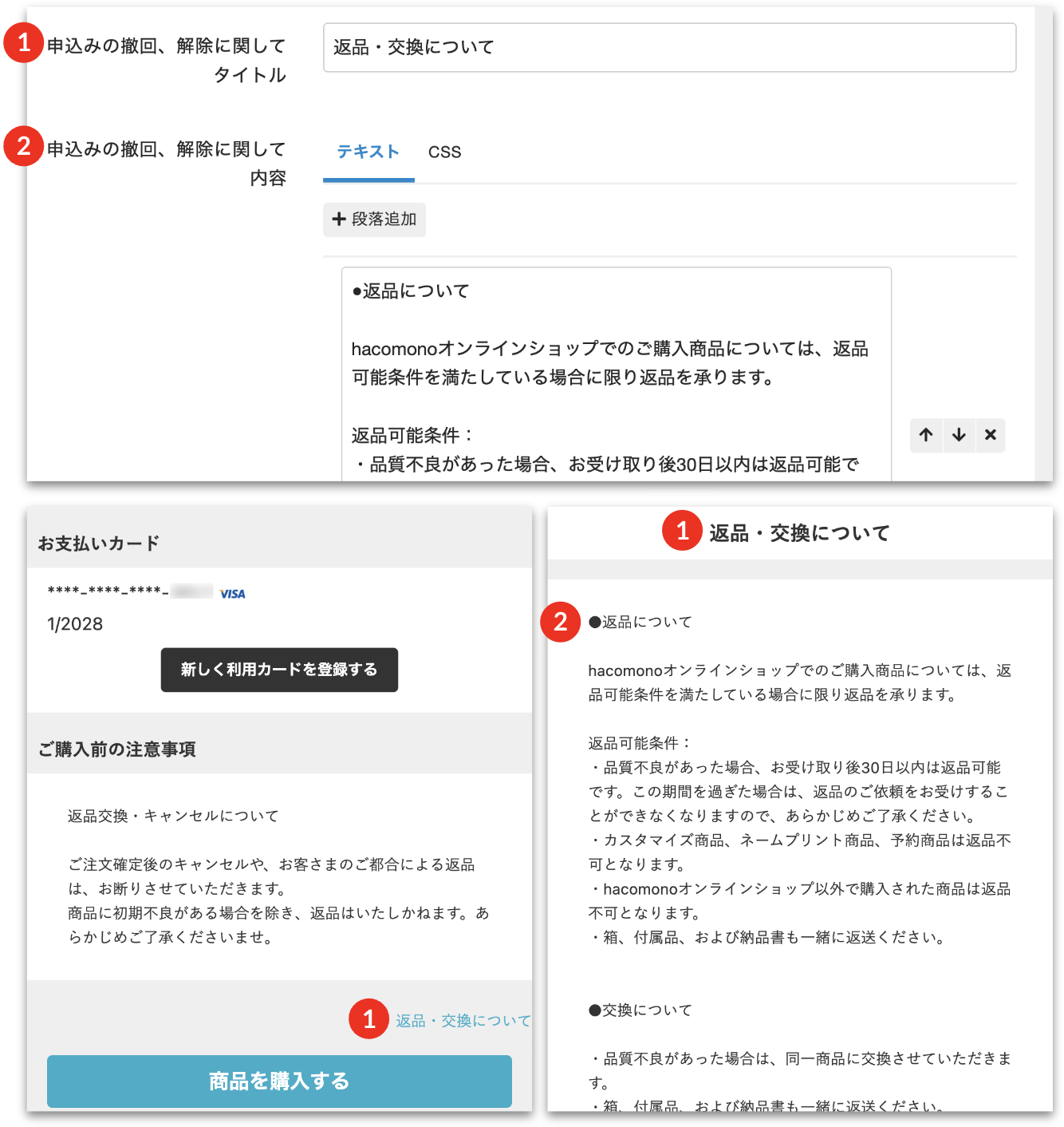 - 購入確認画面で特定商取引法に対応した情報を表示する場合、[申込みの撤回、解除に関して タイトル]に情報表示画面へのリンクのタイトル(下図の①)を入力します。[申込みの撤回、解除に関して 内容]の[設定を開始する]をクリックし、[段落追加]をクリックして設定行を追加し、本文(下記の②)を入力します。Note: [申込みの撤回、解除に関して タイトル]が未設定(空欄)の場合、メンバーサイトの購入確認画面には、タイトルのリンクは表示されません。Note: 段落を複数表示する場合は、[段落追加]をクリックして設定行を追加します。