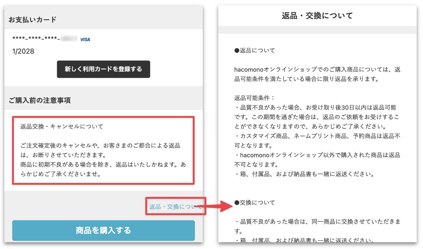メンバーサイトのオンラインショップの購入確認画面には、購入前の注意事項や特定商取引法に対応した情報を表示することができます。表示する内容は、運用に合わせて任意のテキストを設定することができます。