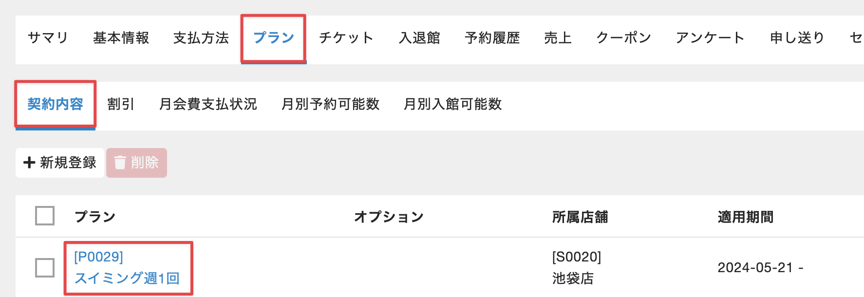 メンバー詳細画面で[プラン]>[契約内容]タブを選択し、契約中のプラン名をクリックします。
