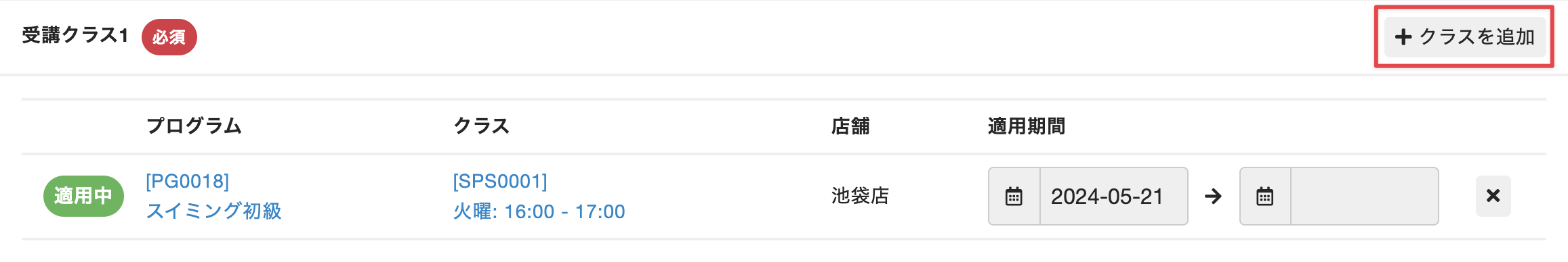 - 変更後のクラスの[適用期間]に、変更後のクラスの開始日を設定します。変更前のクラスの[適用期間]には自動的に終了日が設定されます。