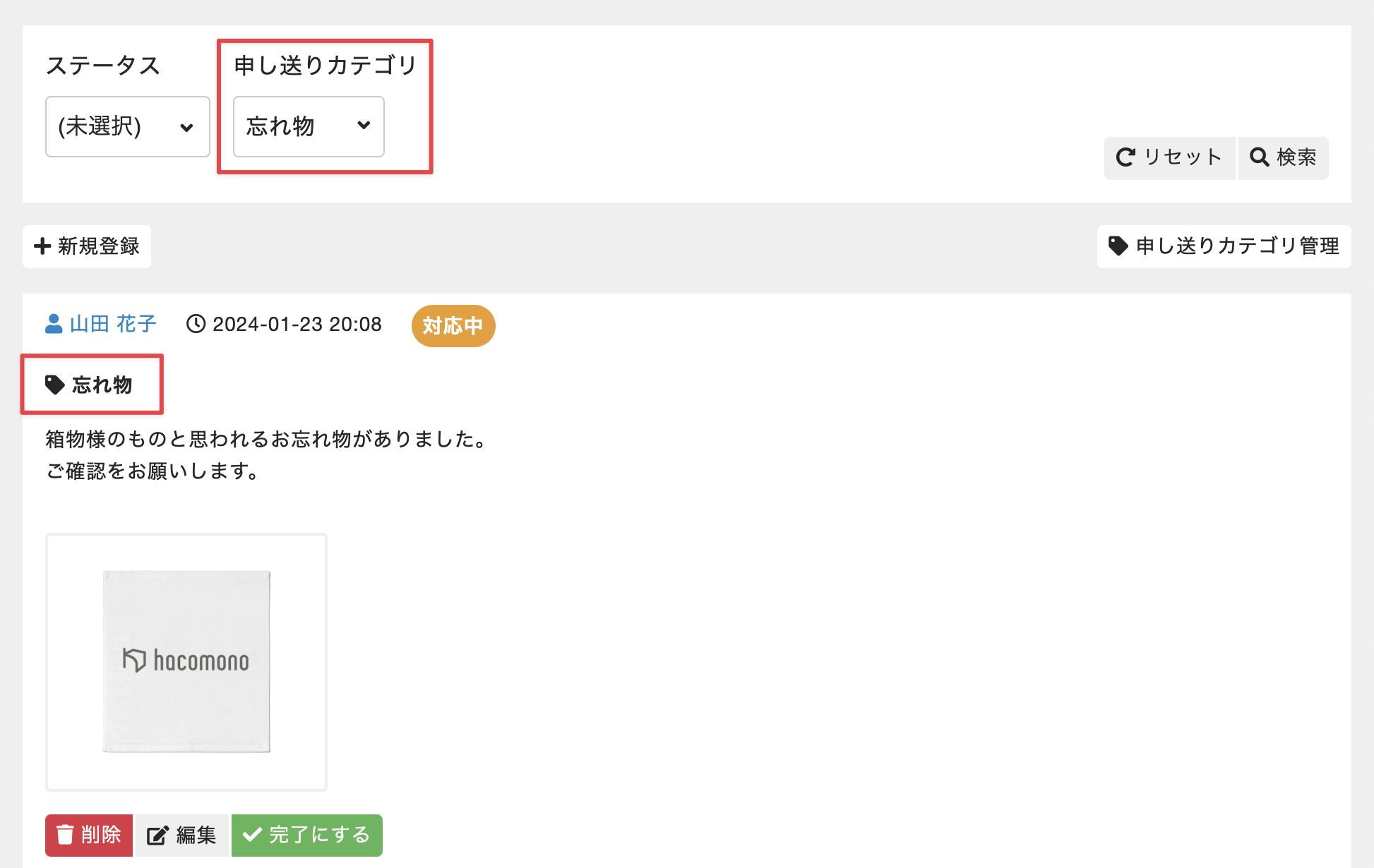 申し送りに申し送りカテゴリを設定しておくと(「申し送りを登録する」を参照)、申し送りの内容を容易に把握できるようになります。また、申し送りの一覧を申し込みカテゴリで絞り込み表示することができます。