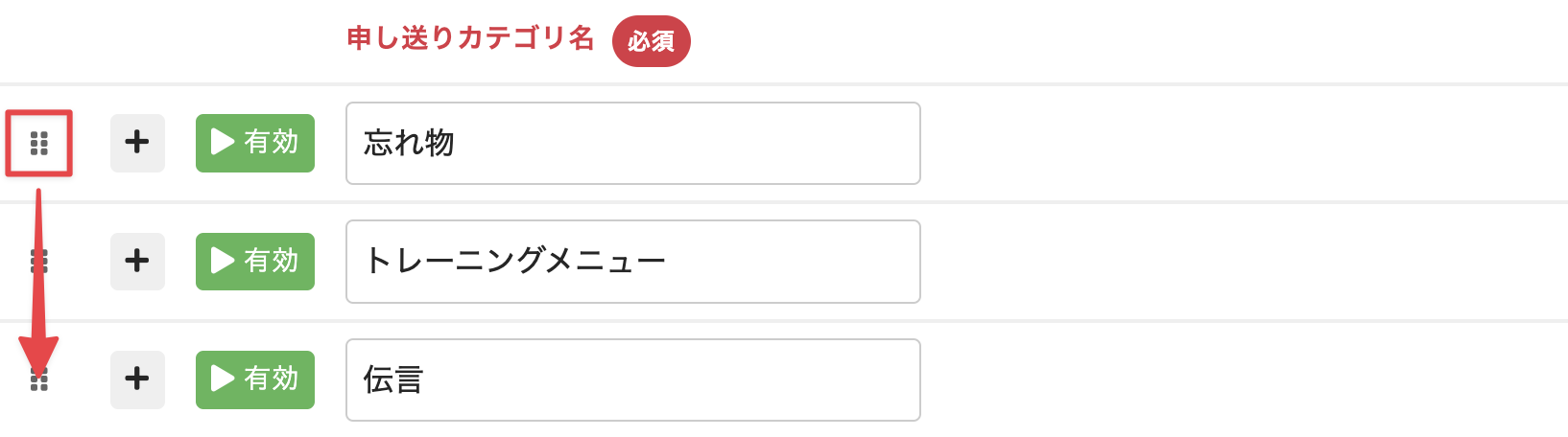 Note:申し送り登録時の申し送りカテゴリの選択では、申し送りカテゴリ画面の一覧の並び順で申し送りカテゴリの一覧が表示されます。並び順を変更するには、移動したい申し送りカテゴリの行の左端のアイコンにマウスポインタを合わせて、移動先の位置にドラッグ&ドロップします。