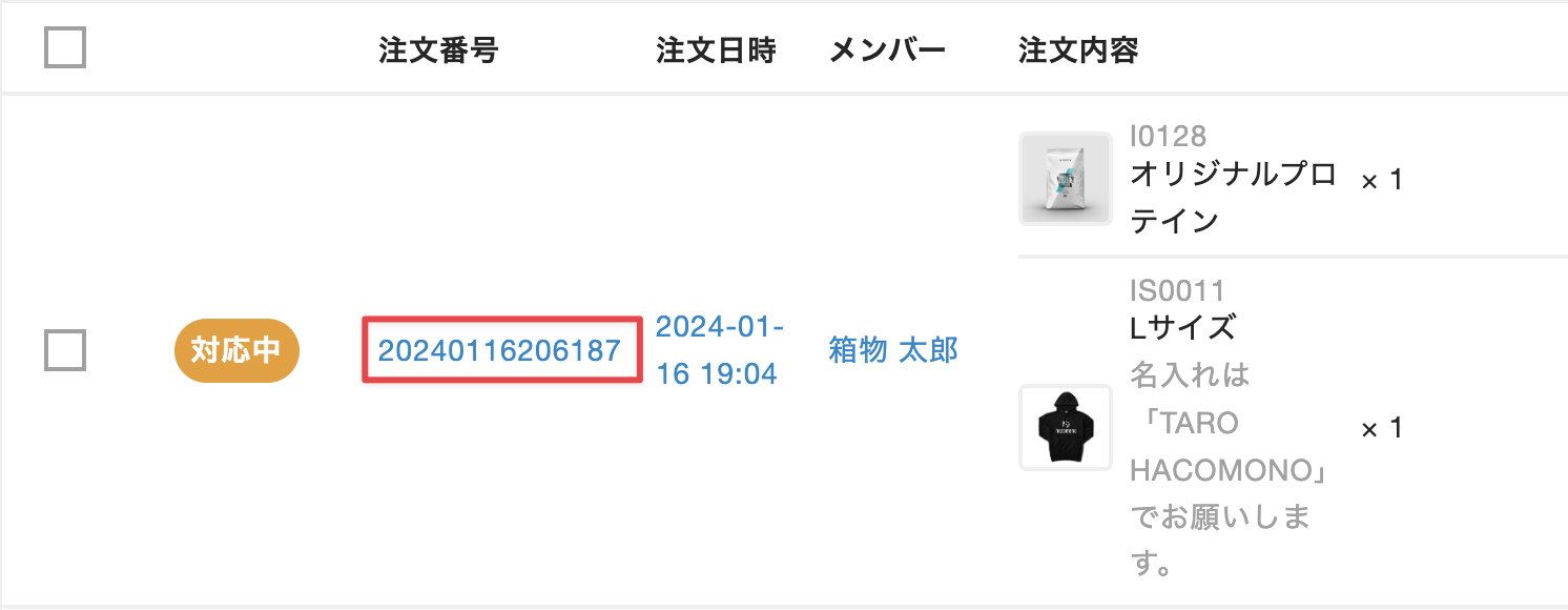 - 管理サイトのサイドバーから[オンライン物販]>[注文]を選択し、注文の一覧画面で確認対象の注文の[注文番号]をクリックします。