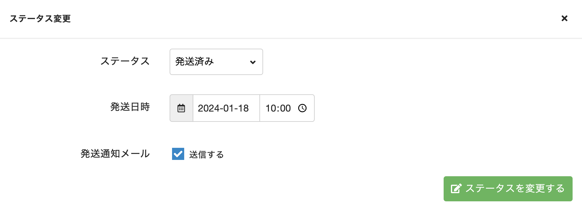 - 注文全体としての状態が変わった場合、[注文詳細]タブの[基本設定]で[ステータス変更]をクリックして注文のステータスを変更します。Note: ステータス変更画面では、ステータスに応じて、[発送日時]や[引き渡し日]を指定します。[ステータス]を[発送済み]にした場合、発送通知メールを送信するときは、[発送通知メール]で[送信する]にチェックを入れます。