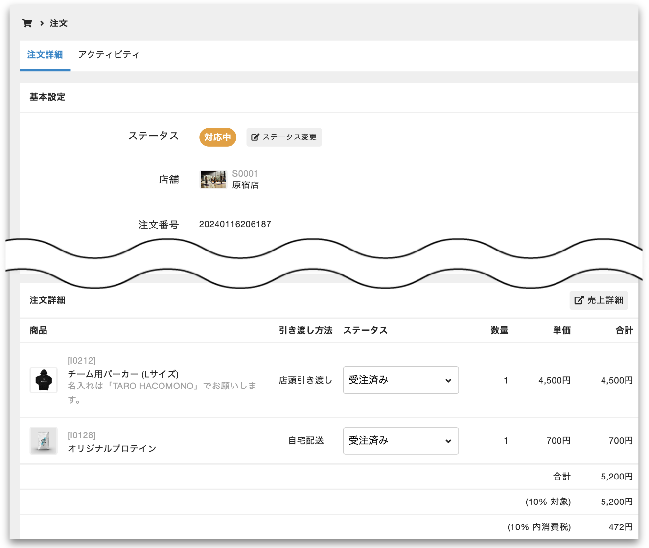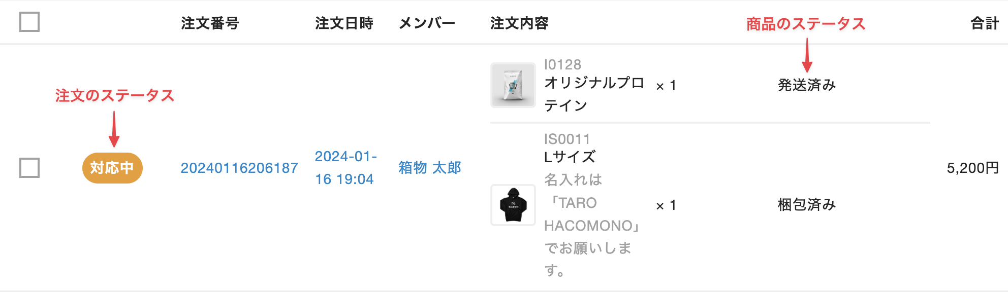 - 注文内の商品のステータス(受発注管理ステータス): 受注済み(初期値)、対応中、発送済み、引き渡し済み
