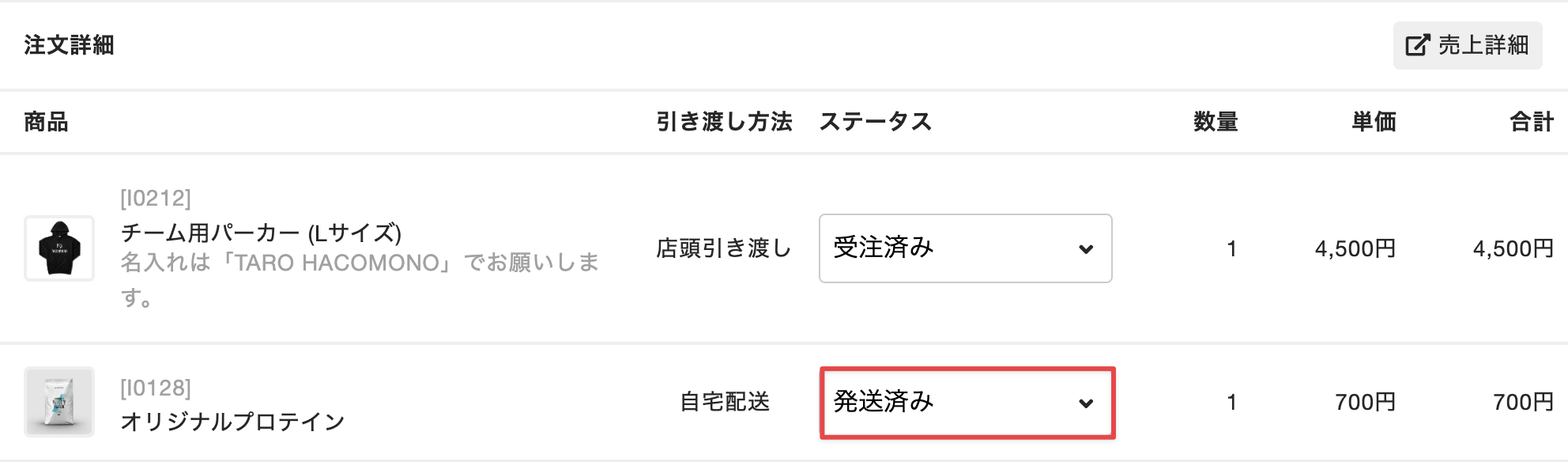 [注文詳細]タブの[注文詳細]で、状態の変わった商品の[ステータス]を変更します。