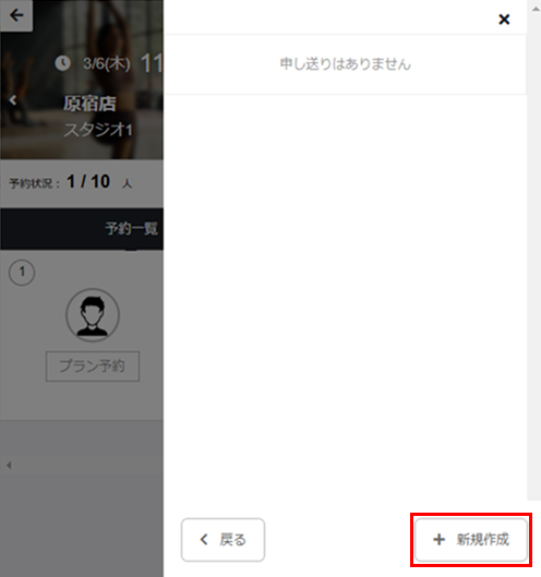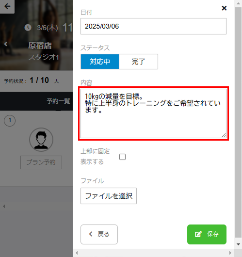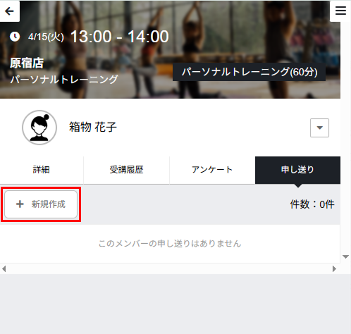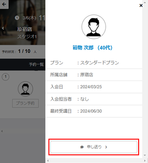 レッスンの詳細画面の[予約一覧]タブで、申し送りを登録するメンバーの名前をタップし、[申し送り]をタップします。 -