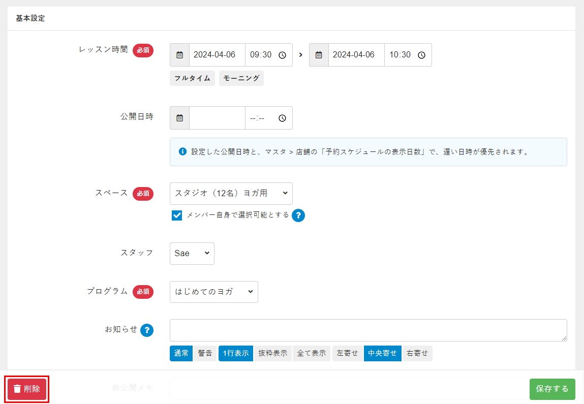 休講を設定したレッスンがスケジュール画面から削除されます。