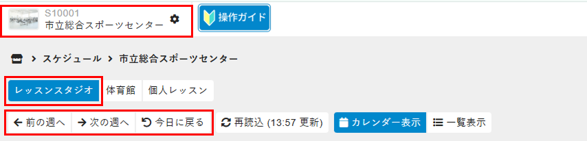 - 画面上部の店舗、予約カテゴリ、休講するレッスン日の週を選択します。