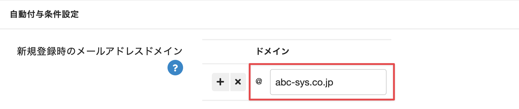 [新規登録時のメールアドレスドメイン]の[追加]をクリックし、ドメインを指定します。Note:複数のドメインを条件に指定する場合は、[+]をクリックして設定行を追加します。