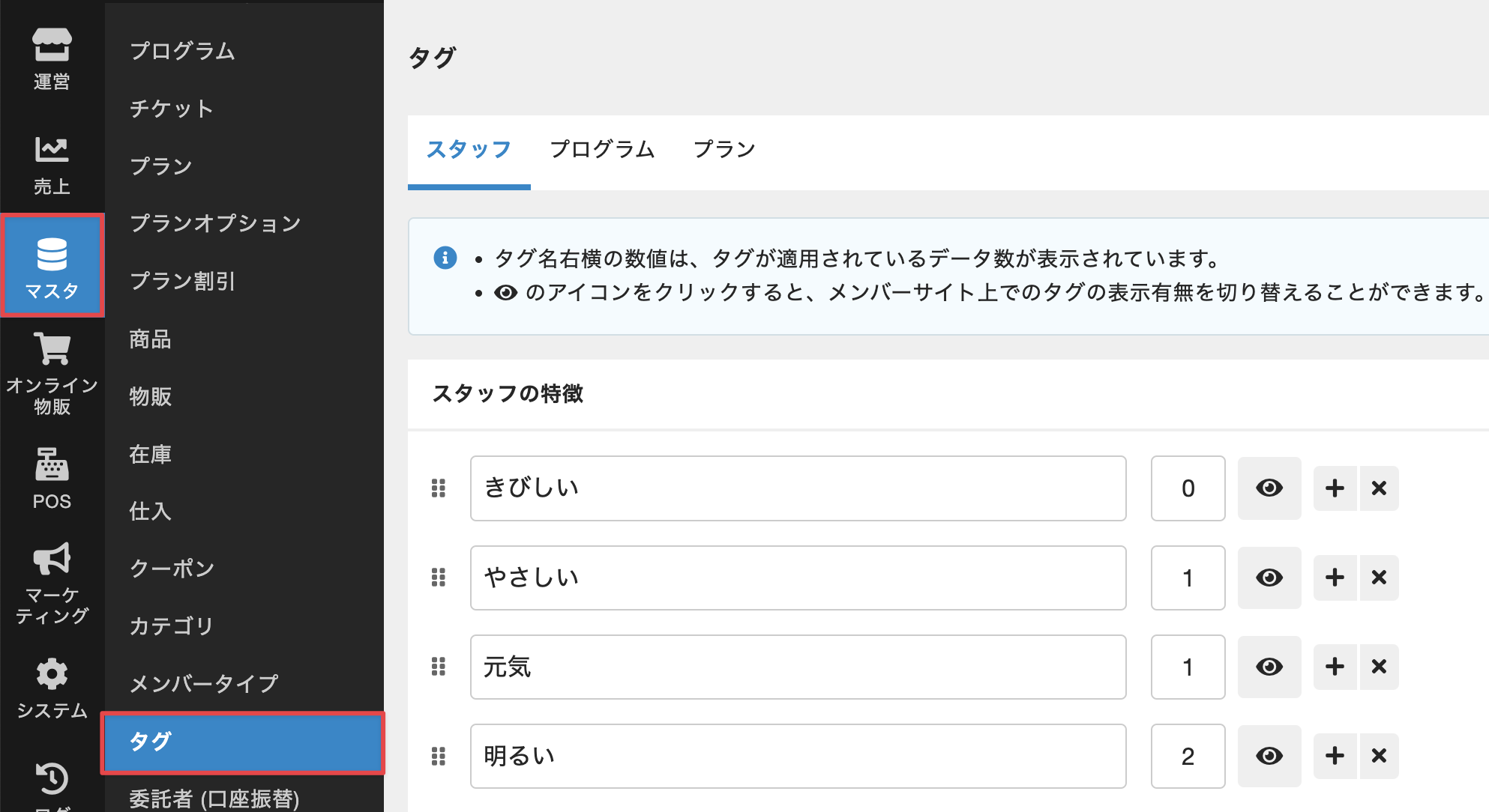 スタッフマスタ、プログラムマスタ、プランマスタに設定したタグは、タグマスタに登録されます。