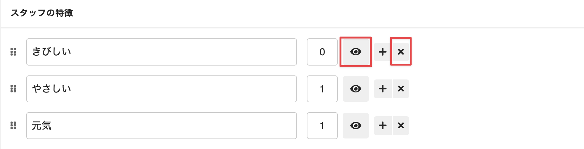- 非表示にする場合は目のアイコンを、削除する場合は[×]をクリックします。
