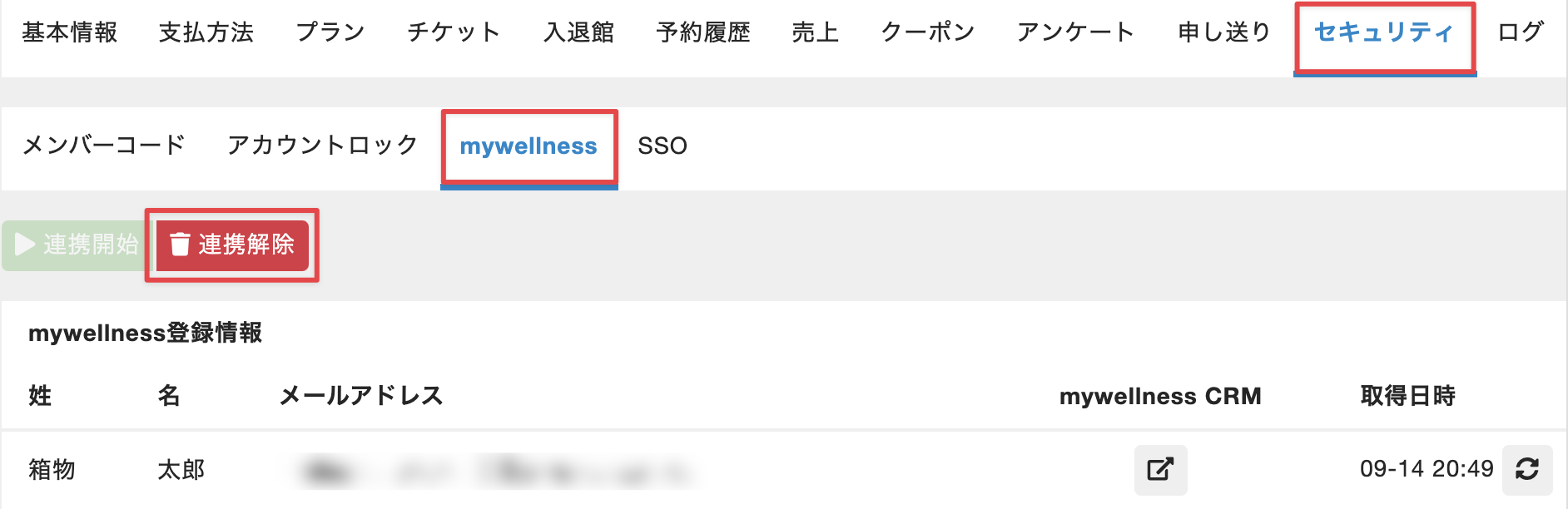 - メンバー詳細画面で[セキュリティ]>[mywellness]タブを選択し、[連携解除]をクリックします。