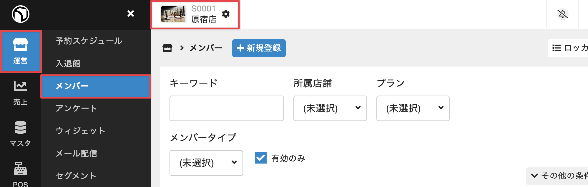 - 管理サイトのサイドバーから[運営]>[メンバー]を選択し、画面上部からメンバーが所属する店舗を選択します。