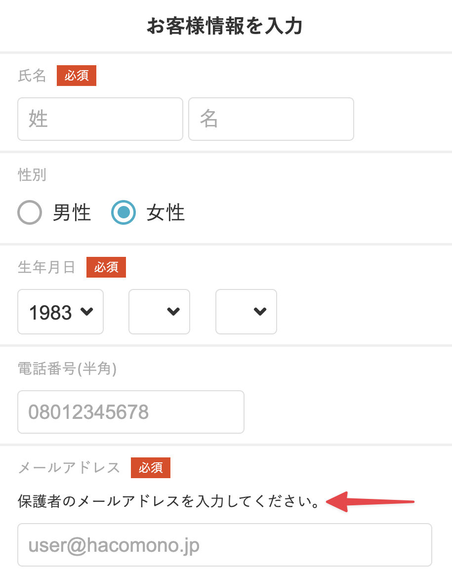 例えばキッズ向けのスクールなどで保護者が子ども名義のアカウントを登録するような運用の場合、新規会員登録画面のメールアドレスに保護者のメールアドレスを入力いただくよう補足説明で促すことができます。