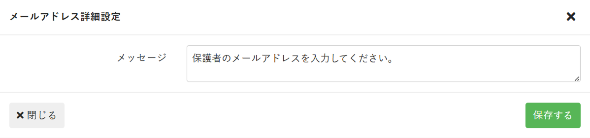 - メールアドレス詳細設定画面で[メッセージ]に補足説明を入力し、[保存する]をクリックします。