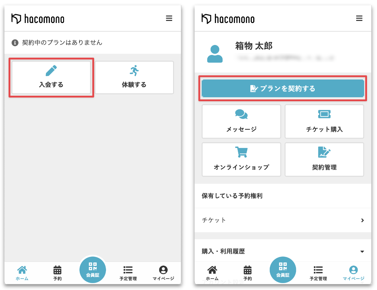 プランの契約前に体験レッスンの受講を必須としている場合、体験レッスンを受講するまで、メンバーサイトのプラン契約用の導線(ホーム画面の[入会する]、マイページ画面の[プランを契約する])を非表示にすることができます。