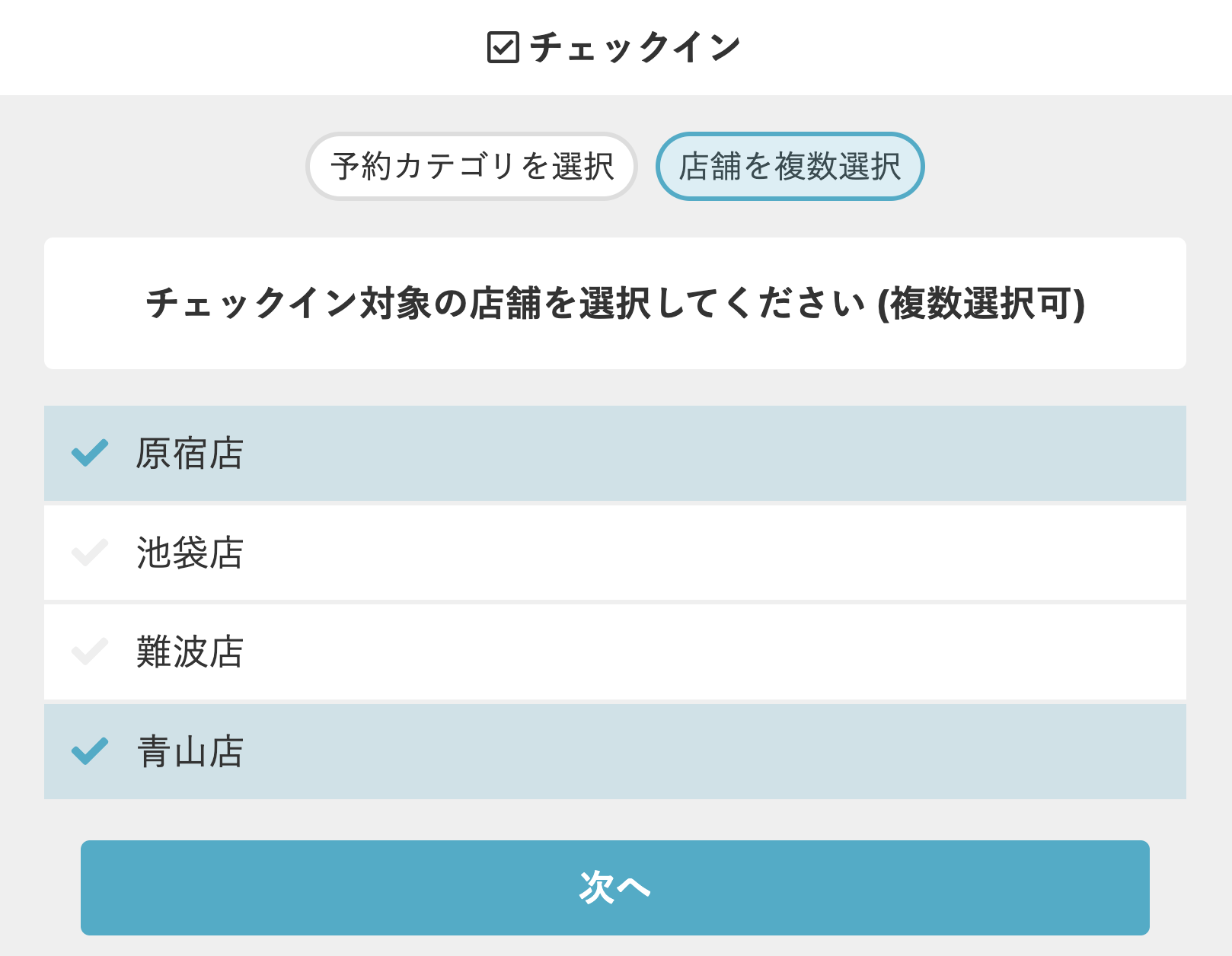 イベント利用などの都合で、複数店舗のチェックインを受け付ける場合は受け付ける店舗を複数選択し、【次へ】ボタンをタップします。