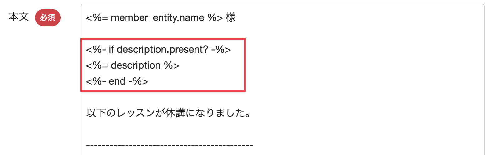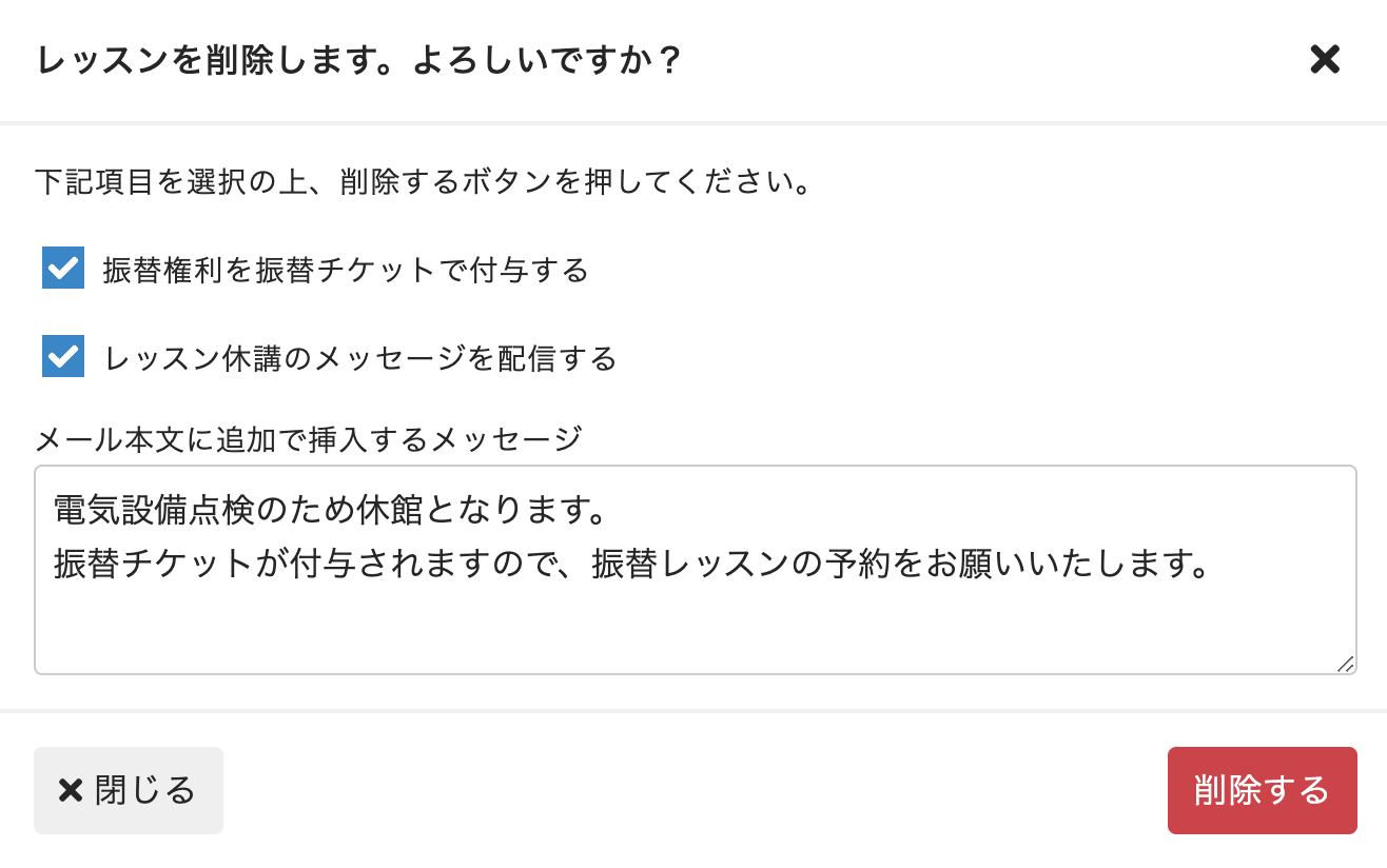 - [レッスン休講のメッセージを配信する]:休講のお知らせメールが配信されます。メールに挿入するメッセージを入力します。