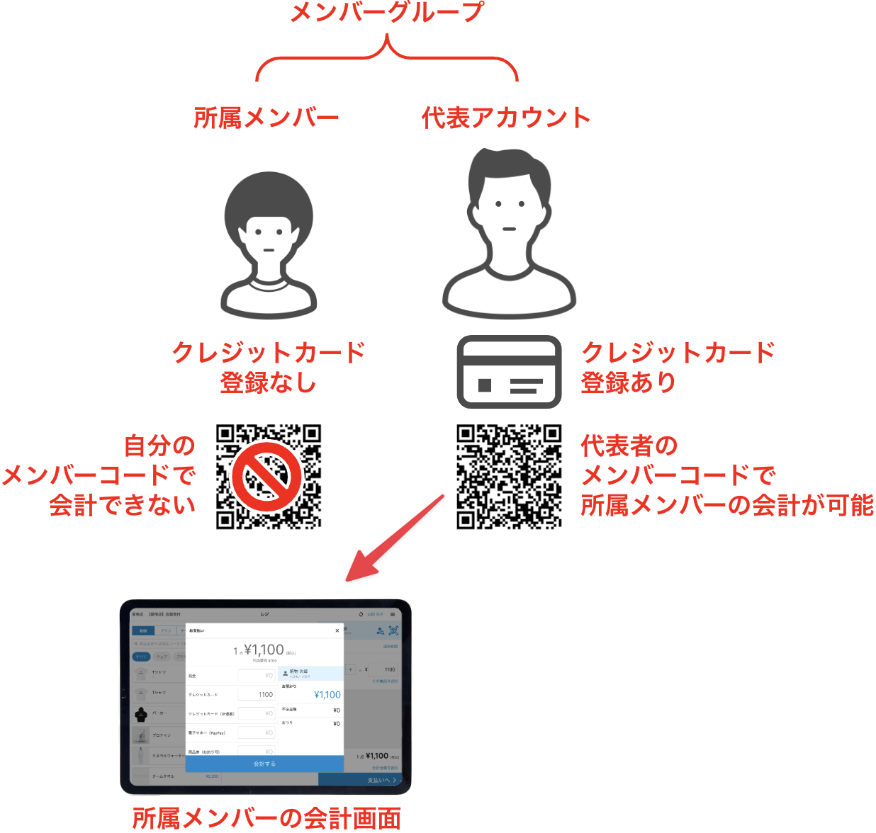 メンバーグループの所属メンバーの会計時、代表者のメンバーコードをPOSレジアプリで読み取り、代表者のクレジットカードで決済することができます。