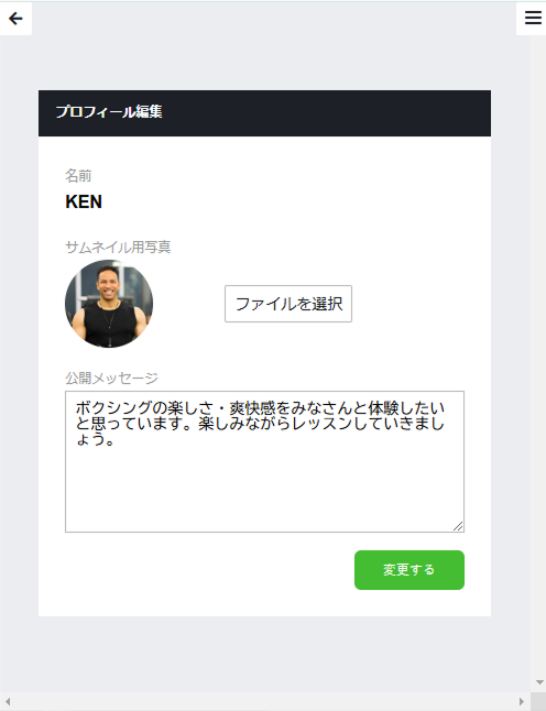 スタッフ管理サイトからプロフィール写真やメッセージを編集することができます。プロフィールは、メンバーサイトの予約画面に表示されます(「スタッフを設定する」を参照)。