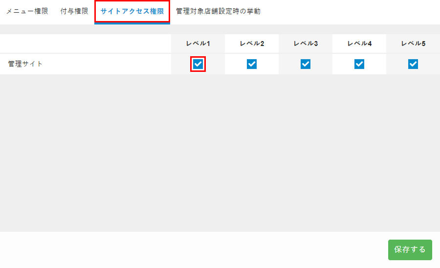 [サイトアクセス権限]タブをクリックし、[レベル1]の[管理サイト]にチェックを入れます。