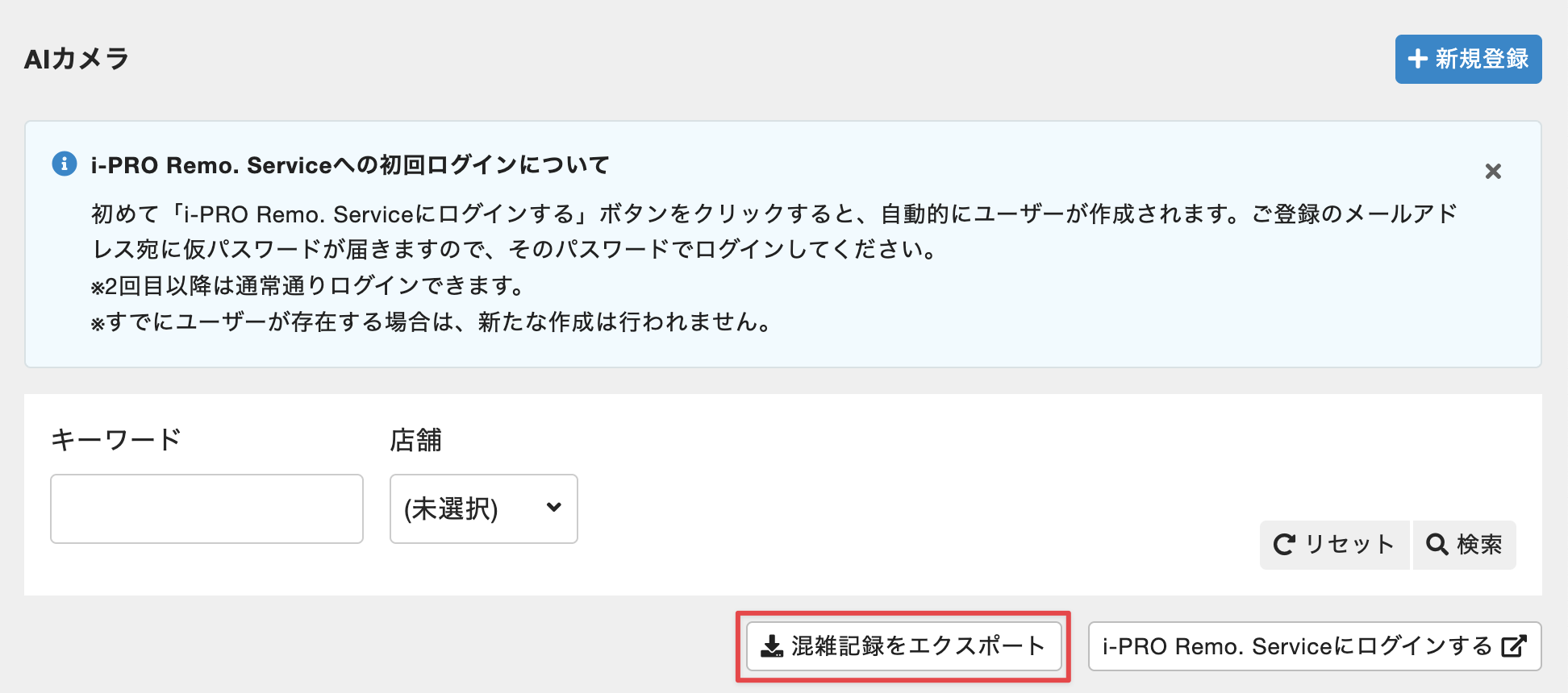 - AIカメラの一覧画面で[混雑記録をエクスポート]をクリックします。