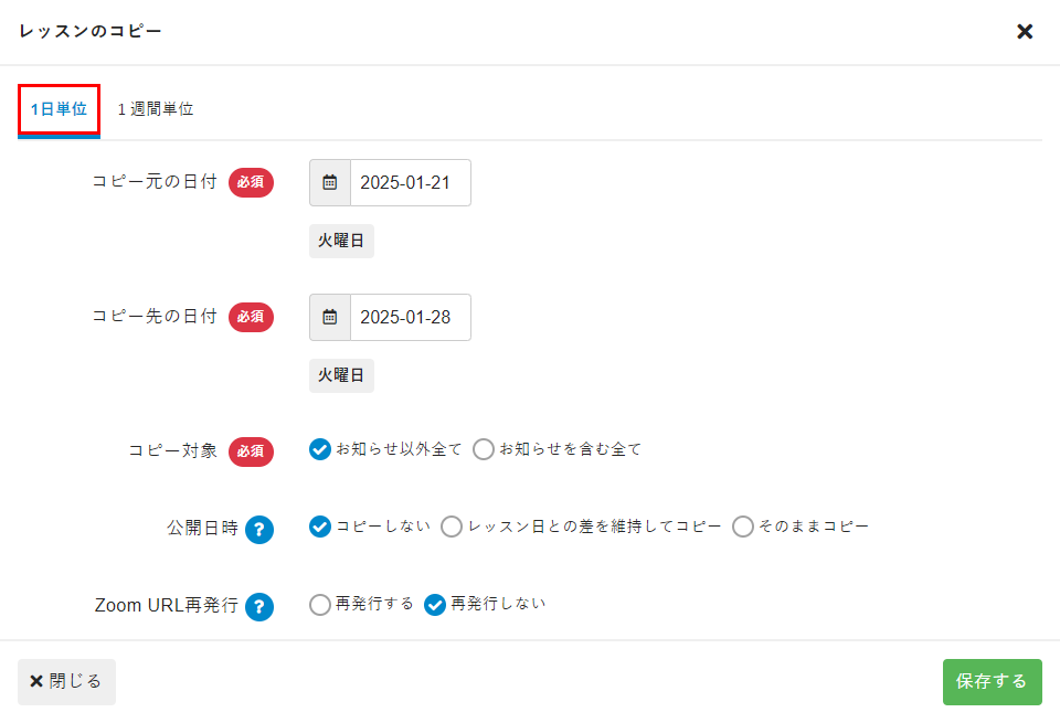 | Zoom URL再発行 | コピー元にオンラインレッスンが設定されている場合、コピー先レッスンの[オンライン配信 URL]、[オンライン配信 ID]、[オンライン配信パスワード]を別の内容で再発行するか設定します。