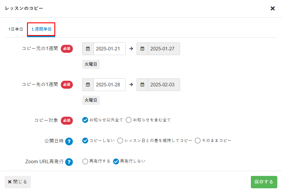 レッスンのコピー画面の[1日単位]タブまたは[1週間単位]タブで、コピーする内容を設定します。各設定項目の詳細については、「設定項目」を参照してください。