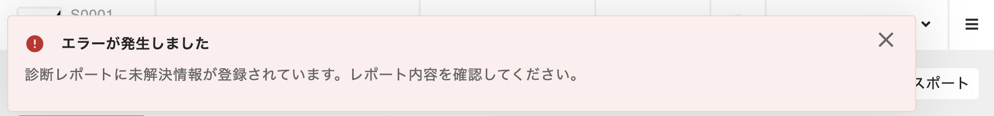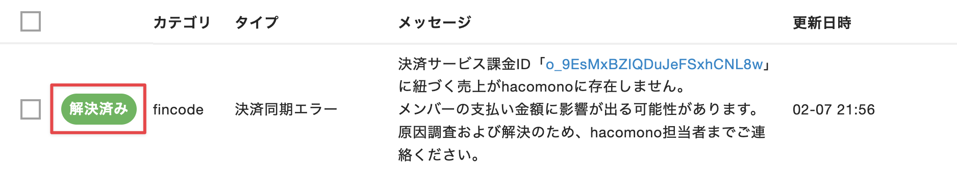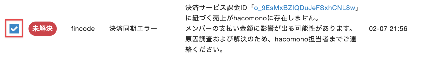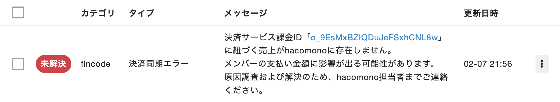 通信障害などの何らかのエラーによりhacomonoとfincodeのデータに不整合が検知された場合は、診断レポートが登録され、管理サイトにエラーメッセージが表示されます。