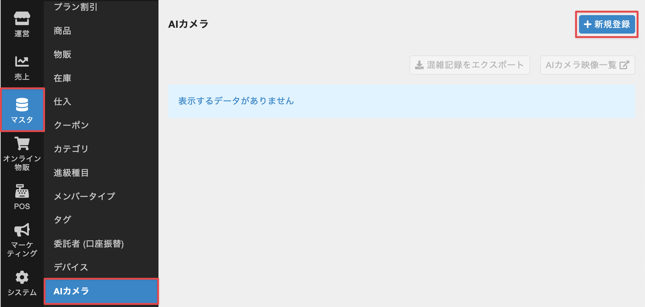 - 管理サイトのサイドバーから[マスタ]>[AIカメラ]を選択し、AIカメラの一覧画面で[新規登録]をクリックします。