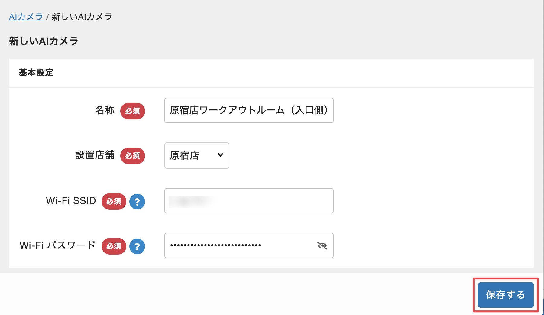 [名称]に、AIカメラを識別できるような名称を入力します(例:「原宿店 ワークアウトルーム(入口側)」)。