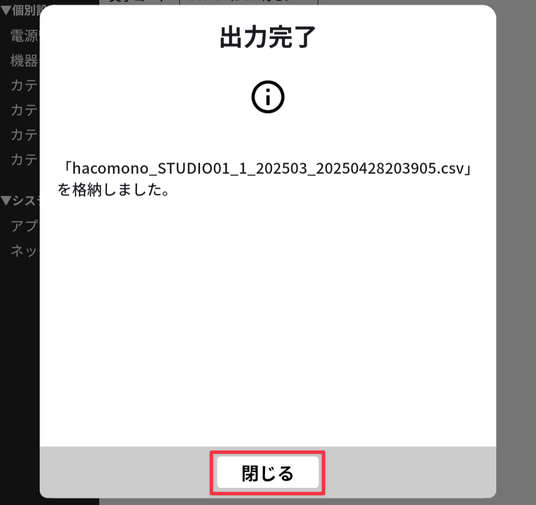 エクスポートが完了すると、出力完了画面が表示され、CSVファイル名が表示されます。[閉じる]をタップして画面を閉じます。 - ファイル名が「ブランドコード_店舗ID_機器ID_対象年月_エクスポート日時.csv」のCSVファイルがフォルダに保存されます。